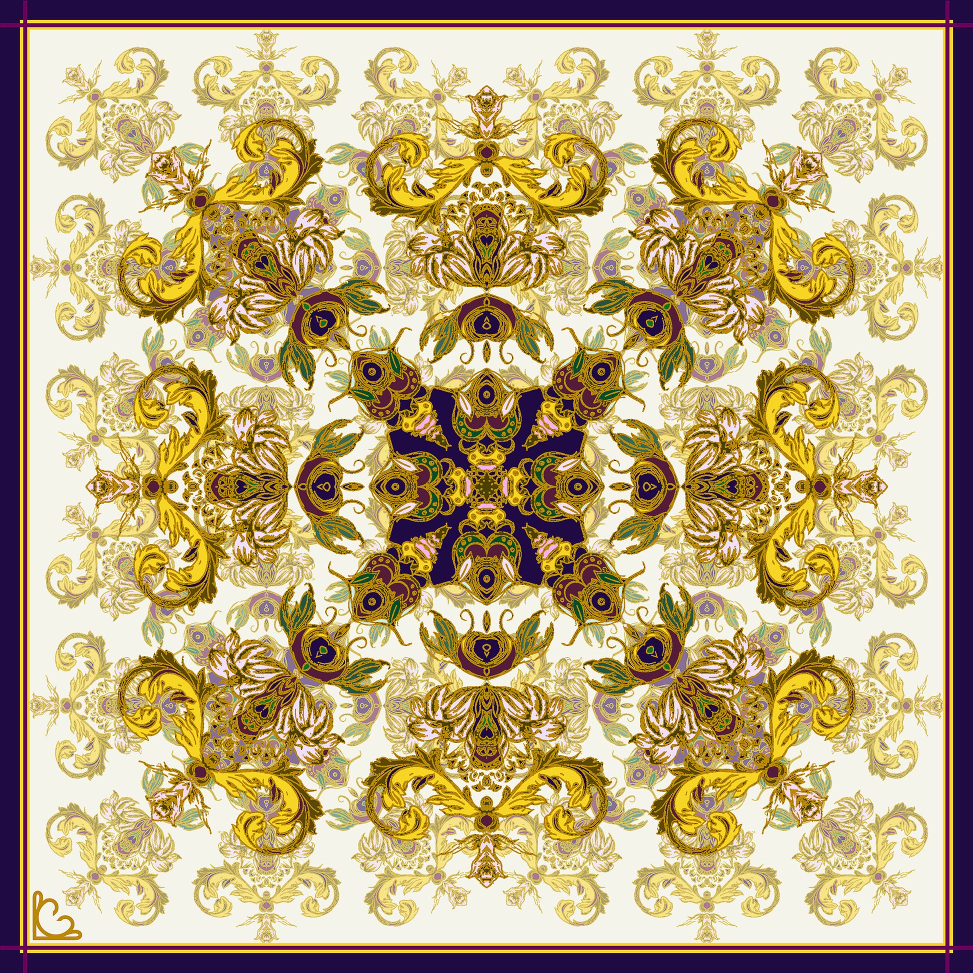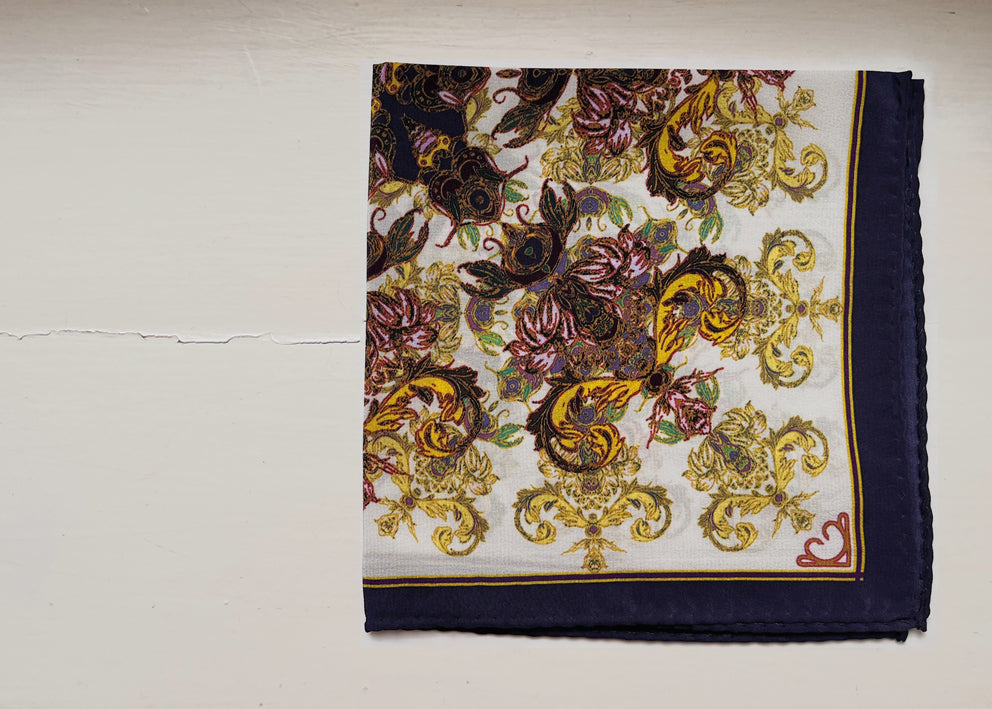 Fashioned from pure silk, this hand designed and finished pocket square was inspired by a sentimental piece of jewellery.The elaborate design and luxurious colours make for a bold and elegant statement. Let it's golds compliment the Summer Sun, and the rich colour combinations warm up your tailored Winter wardrobe.