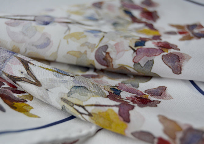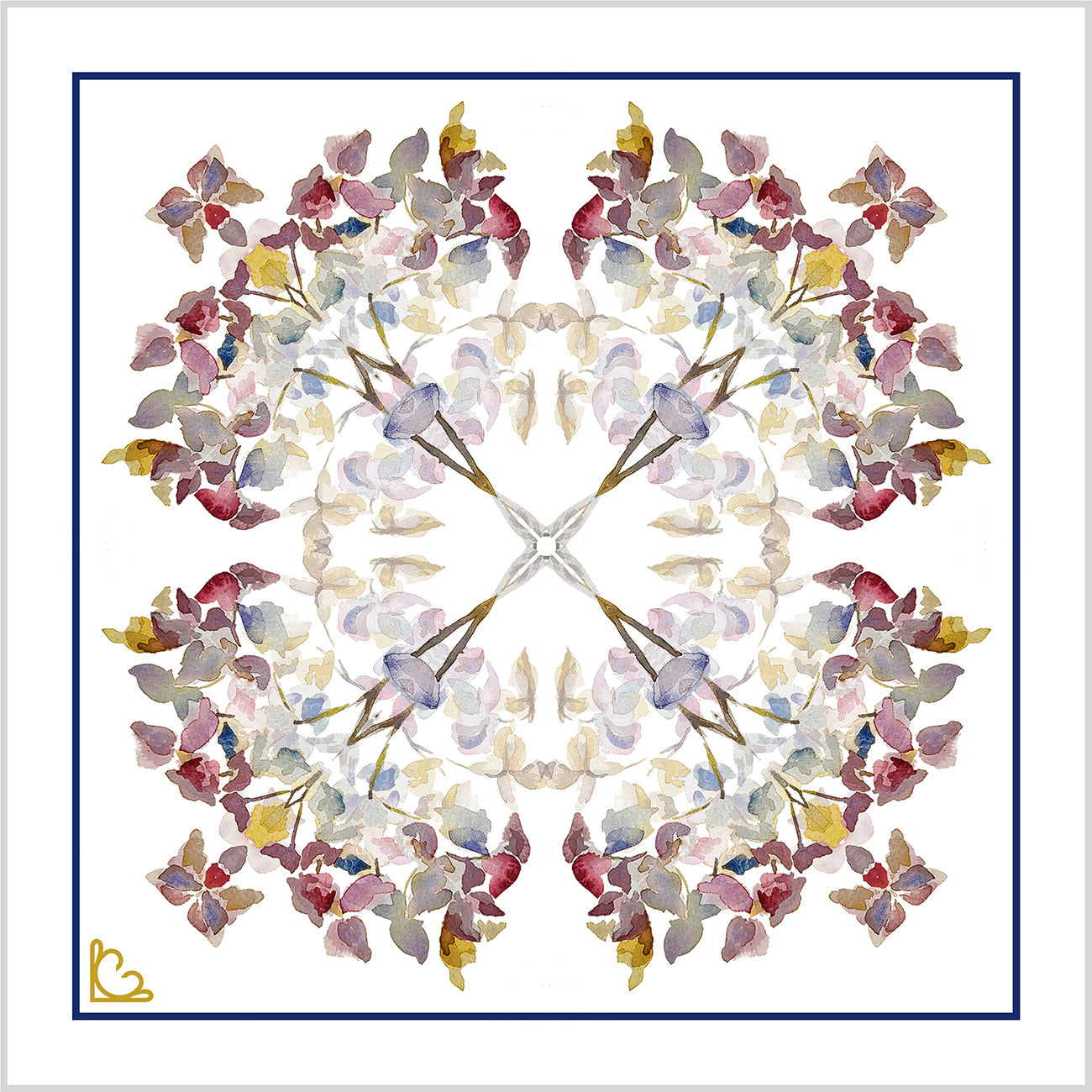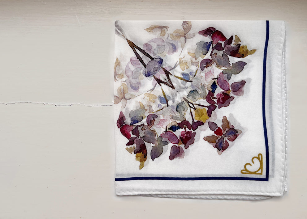 Fashioned from pure silk, this hand designed and finished silk pocket square was inspired by a dried out Hydrangea flower from the gardens of the place of sentiment.Beautiful colours were preserved in the dried out petals, and made more vivid by using a more abstract approach with watercolours. The overall design reflects the original shape of a single hydrangea flower.