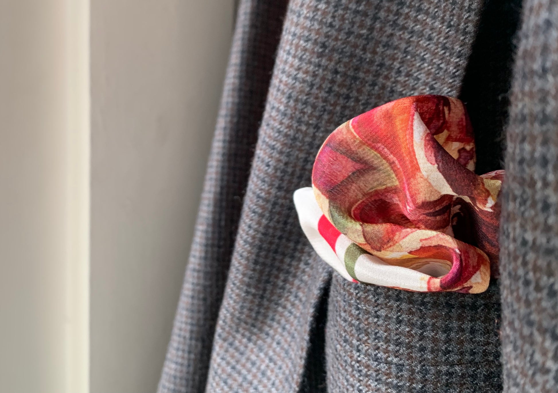 Fashioned from pure silk, this hand designed and finished large pocket square was inspired by a watercolour painting of a dried out Peony flower.