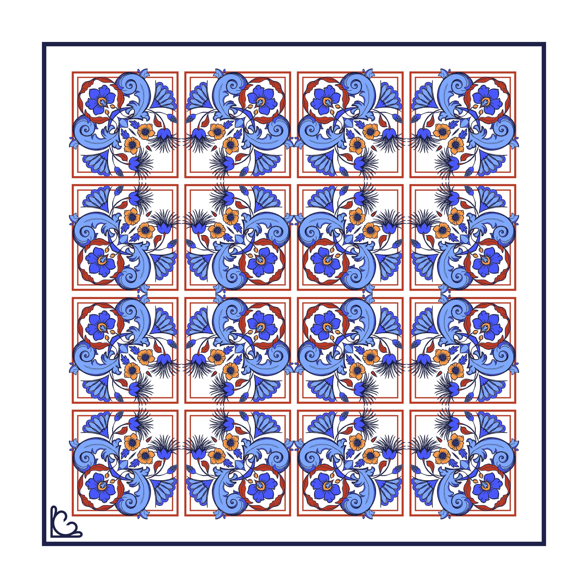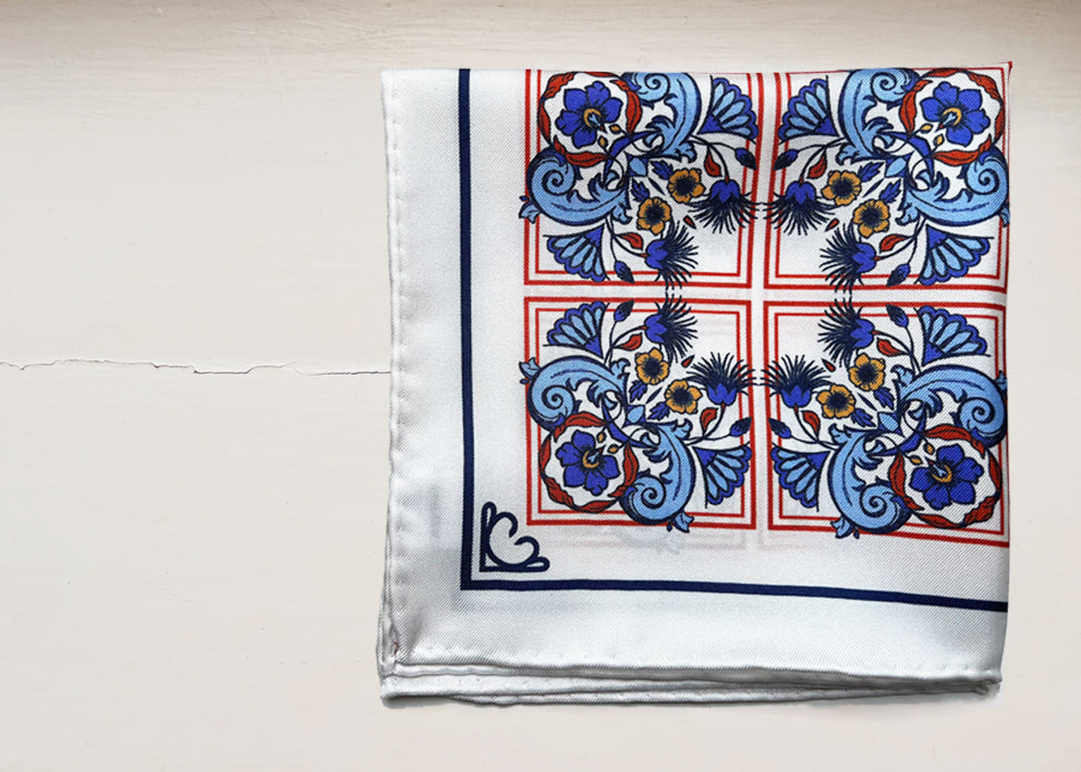 Inspired by the tiles I saw whilst on my trip to Porto, this silk twill pocket square is made up of my hand drawn florals.