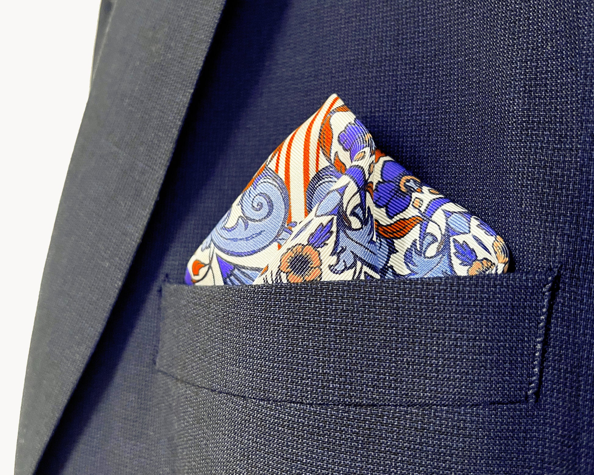 The classic bold colour combination of blues and oranges makes it an extremely complimentary addition to any wardrobe, whether it's used as a hair tie, or as a pocket square.