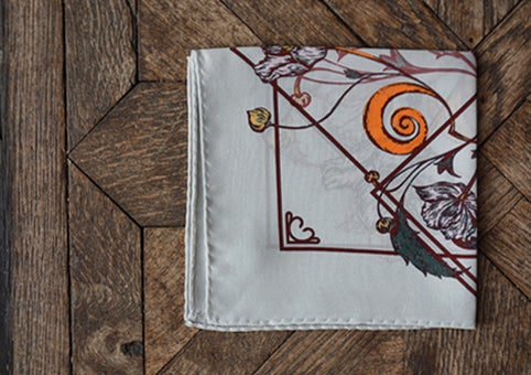 Fashioned from pure silk, this hand designed and finished silk pocket square was inspired by a place where Lauren spent most of her childhood, and still holds close to her heart.The geometric shapes complimenting the detailed drawings of flowers picked from the gardens are inspired by a room where the sun casts shadows of lines that fall over organic and ornate structural forms.
