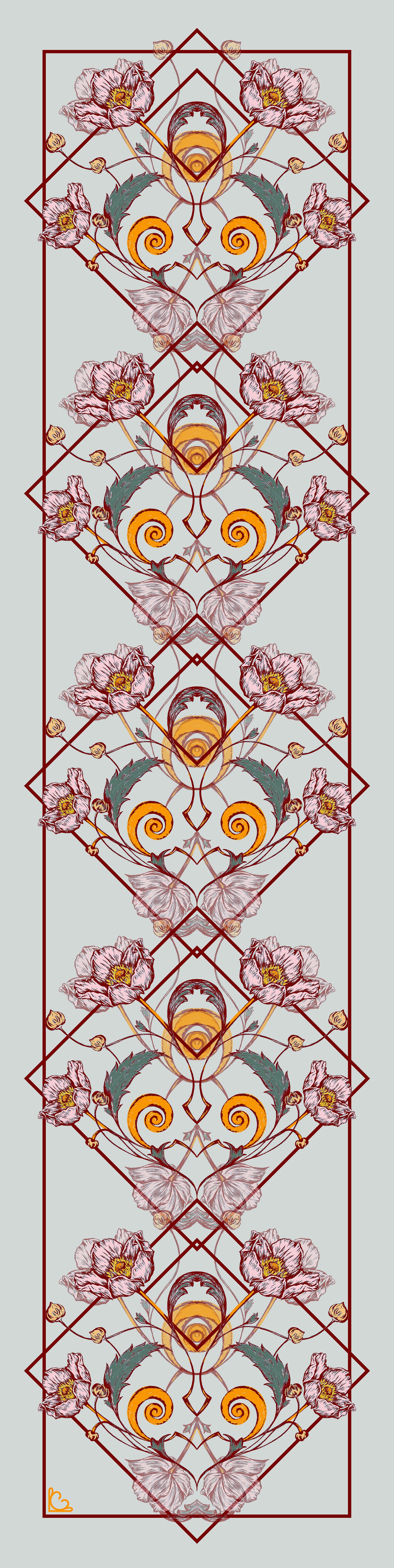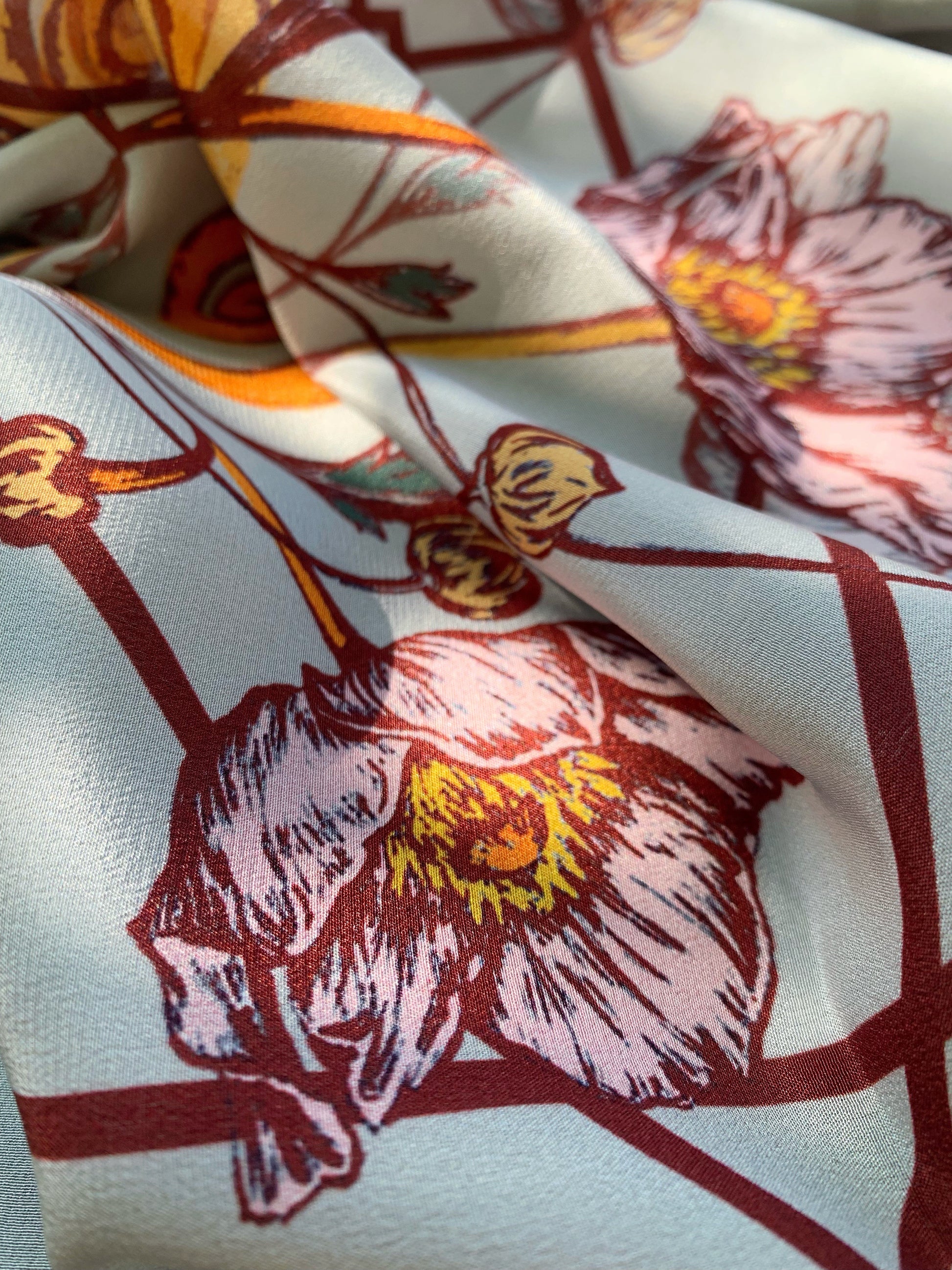Fashioned from pure silk, this hand designed and finished silk scarf was inspired by a place where Lauren spent most of her childhood, and still holds close to her heart.The geometric shapes complimenting the detailed drawings of flowers picked from the gardens are inspired by a room where the sun casts shadows of lines that fall over organic and ornate structural forms.