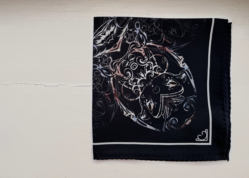 Fashioned from pure silk, this hand designed pocket square was inspired by a trinket box holding a decorative egg that belonged to a beloved relative.